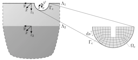 By the superposition of these fundamental systems it is possible to derive solutions also for further geometries like a halfspace with both, cylindrical or spherical cavity and cylindrical trench (2,5D) or a spherical indentation (3D). In addition, different soil layers can be included in the models. For the superposition, the stresses and displacements on the halfspace surface or the inclusion surfaces have to fulfill the real boundary conditions. Finally the equilibrium equations and thus the stiffness matrices are obtained.