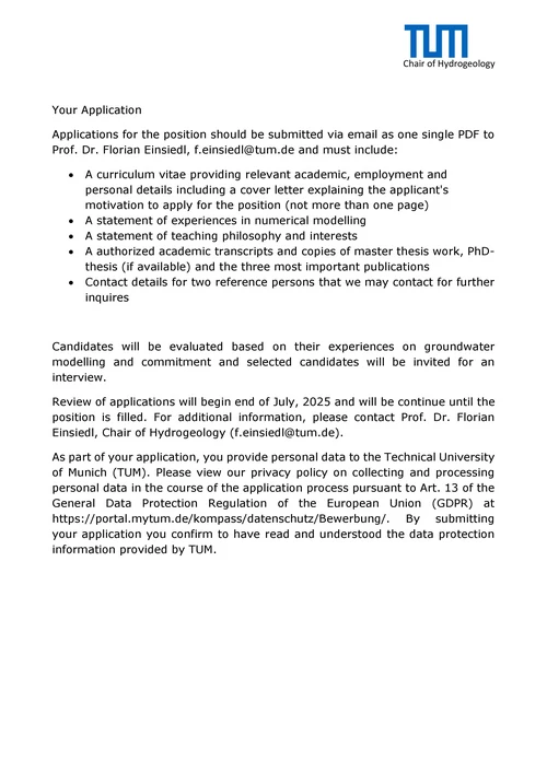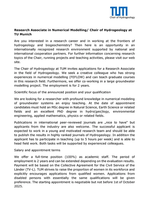 Are you interested in a research career and in working at the frontiers of hydrogeology and biogeochemistry? Then here is an opportunity in an internationally recognized research environment supported by national and international cooperation partners (full information hier).