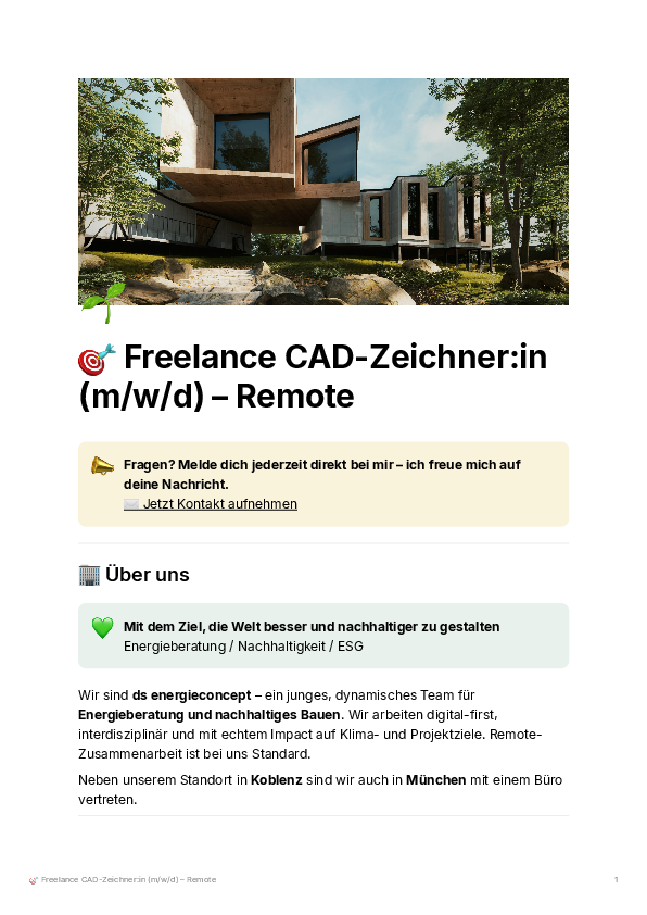 - Erstellung und Pflege von 2D/3D-CAD-Plänen als Grundlage für Energie- & Nachhaltigkeitsnachweise