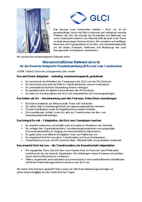 Wissenschaftlicher Referent (m/w/d) für die Bereiche Integrierte Projektabwicklung (IPA) und Lean Construction
