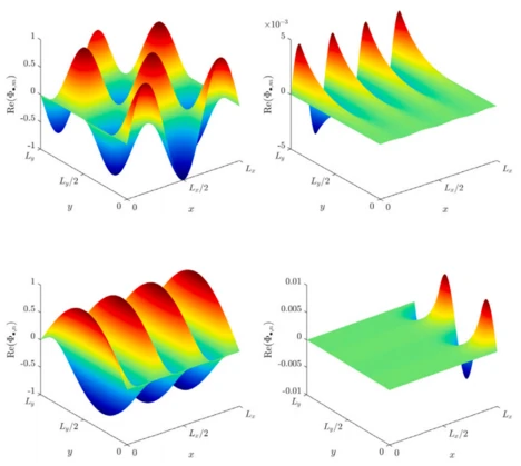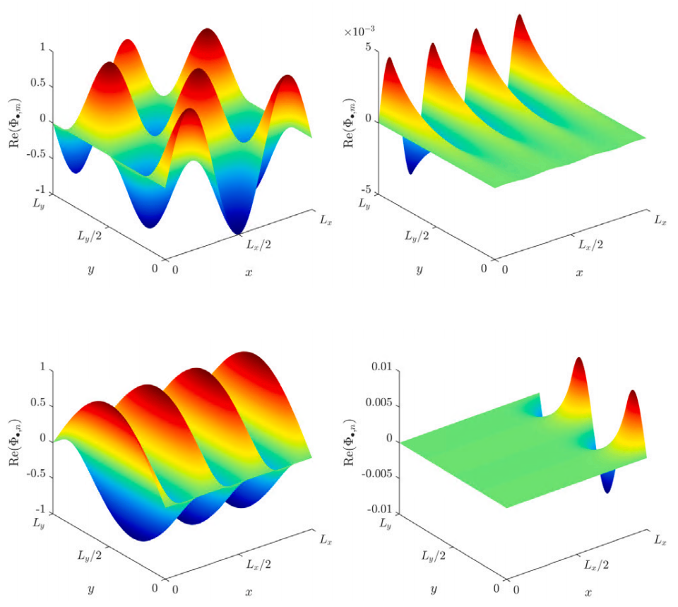 The WBM uses weighted wave functions to approximate the field response of a boundary value problem. In the case of a (poro)elastic medium, field responses encompass, for example, displacements, strains, and stresses. As shown in Fig. 3, each wave function consists of one part, either a cosine- or sine-function, which defines a standing wave in 𝑥- or 𝑦-direction. This is multiplied by a second part (e-function), which describes an evanescent or propagating wave pattern. The number of wave functions is truncated with respect to the highest physical wave number, which is approximated in the system.