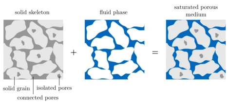 Vibrations in a soil medium can result from natural phenomena, e.g. an earthquake, or events related to human impact (see Fig. 1). Induced soil vibrations may affect nearby buildings by reducing the serviceability and can cause discomfort or health problems for residents. The soil material is often assumed to be an elastic continuum, even though it may consist of several phases, e.g. solid grains, water, air or oil (see Fig. 2). By applying an elastic model to a water saturated soil medium, one of the underlying assumptions is that fluid and solid phase stick together and share the same displacement field. For civil engineering applications, which usually deal with a frequency range from 1 Hz to 250 Hz, this assumption is sufficient if the soil medium consists, for example, of clay, gravel or cobbles. However, fluid and solid phases can vibrate differently in sands and fine silt, which needs to be covered by a poroelastic (numerical) model. Such a poroelastic model is provided, for example, by the Biot theory [Biot 1962].