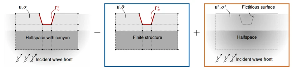 Ground-borne vibrations can also be induced by oblique incident wave fronts, often combined with reflection, refraction, and/or mode conversion processes. Incident wave fronts may result from earthquakes, underground trains, or energy generation processes (e.g. drilling platforms, geothermal power plants). Fig. 7 shows an example of a layered soil domain with an empty canyon, resulting, for example, from a dried river. The system is decomposed into a scattered wave field and a free field solution. The scattered wave field is modeled as a finite structure with the WBM. The free field solution is related to an incident wave front, which is reflected along the surface of the layered halfspace without a canyon. The direct stiffness formulation presented in [Degrande and De Roeck 1992] is applied to compute the free field solution. As shown in Fig. 7, the surface of the canyon is highlighted with red color, corresponding to a fictitious surface in the free field solution. The solutions for the scattered and free field are coupled along this boundary to fulfill the condition of an unloaded surface. For this, additional residual error functions are formulated and weakly enforced. After solving the system of linear equations, the total system's response is computed by superposing the solutions for the scattered wave field and the free field solution.