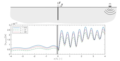 Sheet walls can reduce soil vibrations, which are induced by Rayleigh-waves. A train passage can cause such surface waves. Fig. 6 presents displacement amplitudes, which are computed along the surface of a soil medium with a sheet wall. The system is exposed to a surface load and tested for different degrees of coupling between the water phase and the solid grains. The highest displacement amplitudes are retrieved for strong coupling (blue graph) and loose coupling (red line). In the case of a medium degree of coupling (green line) between fluid and solid phase, viscous damping strongly affects the system, which reduces the computed displacements.