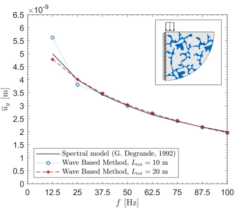 The WBM presents a domain based approach, subdividing a problem into several elements, whose field responses are approximated by wave functions. One big challenge for numerical methods based on space discretization is to mimic a semi-infinite soil medium with a bounded numerical model. Different concepts of absorbing boundaries are established to approximate the Sommerfeld radiation condition. This condition states that the energy in a system propagates to infinity and not from infinity to the system. To approximate the Sommerfeld radiation condition, the absorbing boundary condition (ABC) from [Degrande and De Roeck 1993] is chosen for the WBM, which is local in space and frequency dependent. The derivation of this ABC is based on the analytical solution for a porous medium, and permits perfect absorption of normal incident wave fronts. Fig. 5 shows an exemplary 2D poroelastic soil model with a surface loading. The mean vertical displacement amplitude is evaluated under the loaded strip by testing several excitation frequencies. The results illustrate that the WBM model with an ABC can adequately approximate the reference solution.