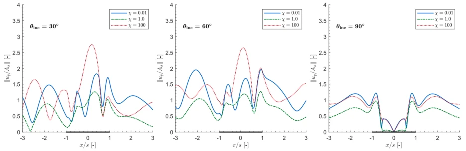 In Fig. 8, vertical displacement amplitudes are depicted, which are evaluated along the surface of a soil domain and canyon. These are computed for an incident S-wave. Different incident angles and degrees of coupling between the fluid and solid phases are tested. The highest displacement amplitudes are retrieved for strong coupling (blue graph) and loose coupling (red line). In the case of a medium degree of coupling (green line) between fluid and solid phase, viscous damping strongly affects the system, which reduces the computed displacements.
