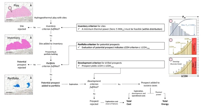 In a joint paper together with Prof. Dr. Michael Drews from the Assistant Professorship of Geothermal Technologies, a simplified portfolio approach with spatially varying subsurface parameters and a cost model was integrated into a Monte Carlo simulation framework. Using the example of the southern German Molasse Basin, the impact of different evaluation approaches on exploration risks, energy yield, and total costs was investigated. The results show: The targeted selection of suitable evaluation criteria is crucial in order to minimize exploration risks. The study advocates a comprehensive top-down planning approach that takes geological and economic framework conditions into account in a standardized manner at the play level - as the key to the effective use of hydrogeothermal energy for the heat transition.