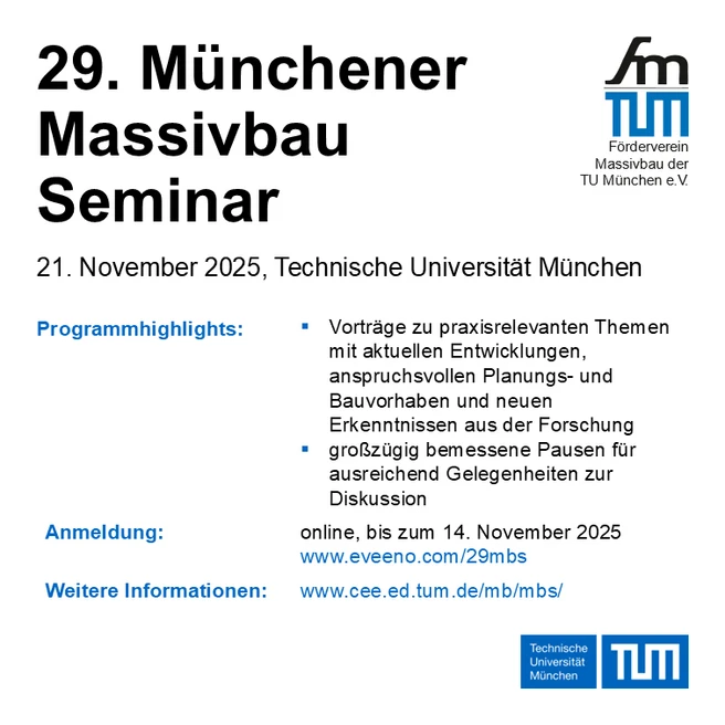 We look forward to interesting presentations, stimulating discussions, an intensive and fruitful professional exchange, and a successful continuation of the meeting of solid construction engineers at TUM.