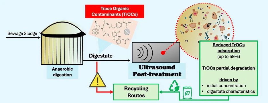 Anaerobically digested sludge (ADS) represents a valuable source of nutrients for recovery within a circular economy framework. However, the presence of trace organic contaminants (TrOCs) in ADS raises concern about its safe reuse. This study is the first to investigate the application of low-frequency ultrasound (US) technology specifically for TrOC reduction in ADS. TrOCs were selected based on their inclusion in the latest revision of the Urban Wastewater Treatment Directive and their actual detected concentrations in real sludge samples. High-intensity US treatment, with energy inputs ranging from 140 to 340 kJ/L, achieved up to 59 % reduction of TrOCs in the biosolid fraction. This reduction was accompanied by an increase in TrOC concentrations in the supernatant, enhancing their availability for further degradation. Sonochemical degradation was verified through experiments conducted at maximum intensity in spiked water solutions, where the formation of transformation products was observed. The extent of mass transfer from the solid to the liquid phase was primarily influenced by the initial TrOC concentration and the digestate’s stability, with more stable digestates exhibiting higher TrOC degradation. Overall, this study provides new insights into the potential of US process as a green technology for ADS valorization, promoting both enhanced contaminant removal and improved nutrient recovery for sustainable sludge management.