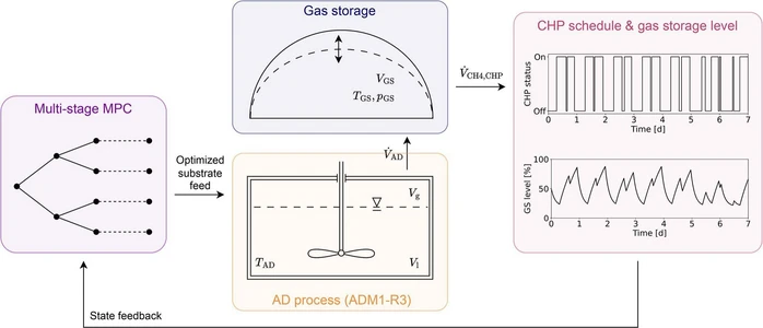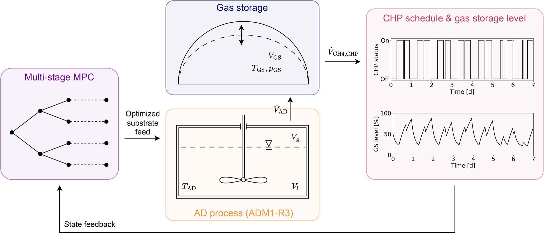 Revenues of anaerobic digestion (AD) plants can be increased by generating biogas and electricity on demand or through biogas upgrading. However, suitable control procedures for individual applications are required to guarantee optimal process conditions. Moreover, substrate characterization at full scale plants is often subject to large uncertainties. In this contribution, a multi-stage nonlinear model predictive controller (NMPC) was designed to optimize substrate feedings under uncertain substrate characterization. Simulations demonstrate that multi-stage NMPC provides biogas on demand to flexibly operate a combined heat and power unit, while safe gas storage filling limits are ensured (20 % safety margin) despite uncertain influent concentrations. Additionally, multi-stage NMPC successfully tracked changing setpoints of constant methane production for biogas upgrading within 12 h, and rejected disturbances posed by disturbing feedings of very high uncertainty. This study demonstrates that model-based control strategies like multi-stage NMPC can enhance the potential of anaerobic digestion plants by enabling demand-oriented operation despite substrate uncertainties and without fundamentally changing the existing hardware, which showcases more sustainable and profitable biogas production.