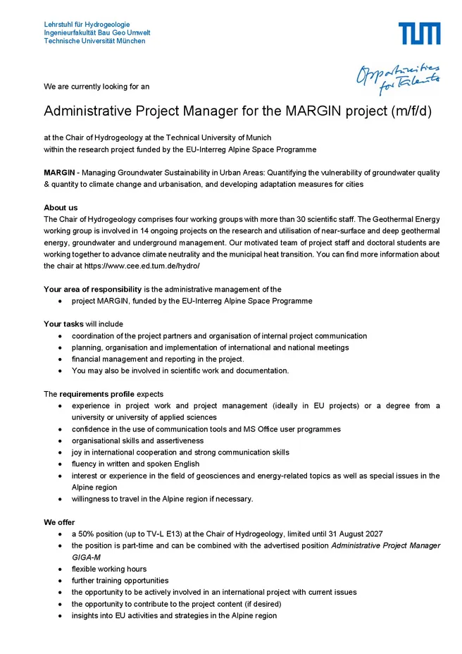Administrative Project Manager for the MARGIN project (m/f/d) at the Chair of Hydrogeology at the Technical University of Munich