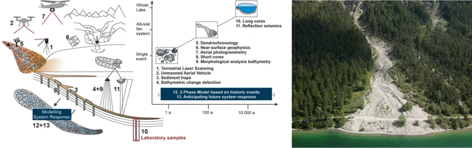 The recent increase of Alpine hazard frequencies and magnitudes is postulated in publications and numerical models predict that these events will occur more frequently and more strongly in the future. However, the likely non-linear increase in Alpine hazard frequencies in recent times is poorly substantiated due to missing or ambiguous long-term records. Thus, ALPHA aims at providing a sound basis for anticipating Alpine hazard frequencies in the foreseeable future under various scenarios of climate change. For existing Alpine lake sediment records, event layers were rarely systematically analyzed, relevant sediment-producing terrestrial Alpine hazard processes were not distinguished, and the magnitudes of these hazards were not derived. In this proposal, we therefore aim to (i) systematically distinguish underlying event processes recorded in lake sediment layers, (ii) estimate the corresponding range of terrestrial process magnitudes, and (iii) decipher the frequency and magnitude increase of phases with elevated climatic forcing such as longer and more intense rainstorms. We hypothesize that Alpine hazard fluctuations in the Holocene Climatic Optimum and the Medieval Warm Period provide the closest analogy for future climate change scenarios. Their understanding enables us to anticipate the likely non-linear and non-stationary increases in Alpine hazard frequencies and magnitudes in the immediate future. In ALPHA, we investigate the lakes Plansee and Achensee (supersites; for long-term event chronologies) as well as Walchensee and Eibsee (complementary sites; for understanding extreme events) in the Bavarian-Tyrolian Landslide Cluster, a globally known hotspot of Late Holocene Alpine hazard events. They were selected due to the quantity of important data gained from systematic pre-studies, including geomorphological mapping, terrestrial and lacustrine geophysics, LiDAR (Light Detection and Ranging) and photogrammetric surface change detection, bathymetric mapping, and sedimentological and geochemical analysis of sediment cores. For the first time, we (i) apply a 4D approach on subaquatic sediment transport by repeated geophysic surveys, repeated coring and calibration using sediment traps, (ii) relate erosion processes, transport and subaquatic deposition in mass and momentum balances, and (iii) link sediment volume in the lacustrine sink with measured terrestrial upstream erosion and mass movement rates calibrated on annual, decadal, and millennial time scales. ALPHA aims at advancing process-understanding of (i) the natural drivers, (ii) sediment sources, (iii) transport mechanisms, and (iv) deposition patterns under fluctuating environmental controls. Future projections of intensity, frequency and seasonality of natural hazards will be developed based on regional climate models with rainfall intensities evaluating the nonstationary response of Alpine hazard frequency rates to global warming.